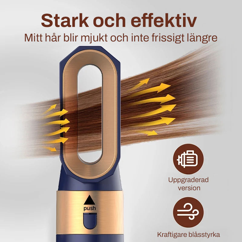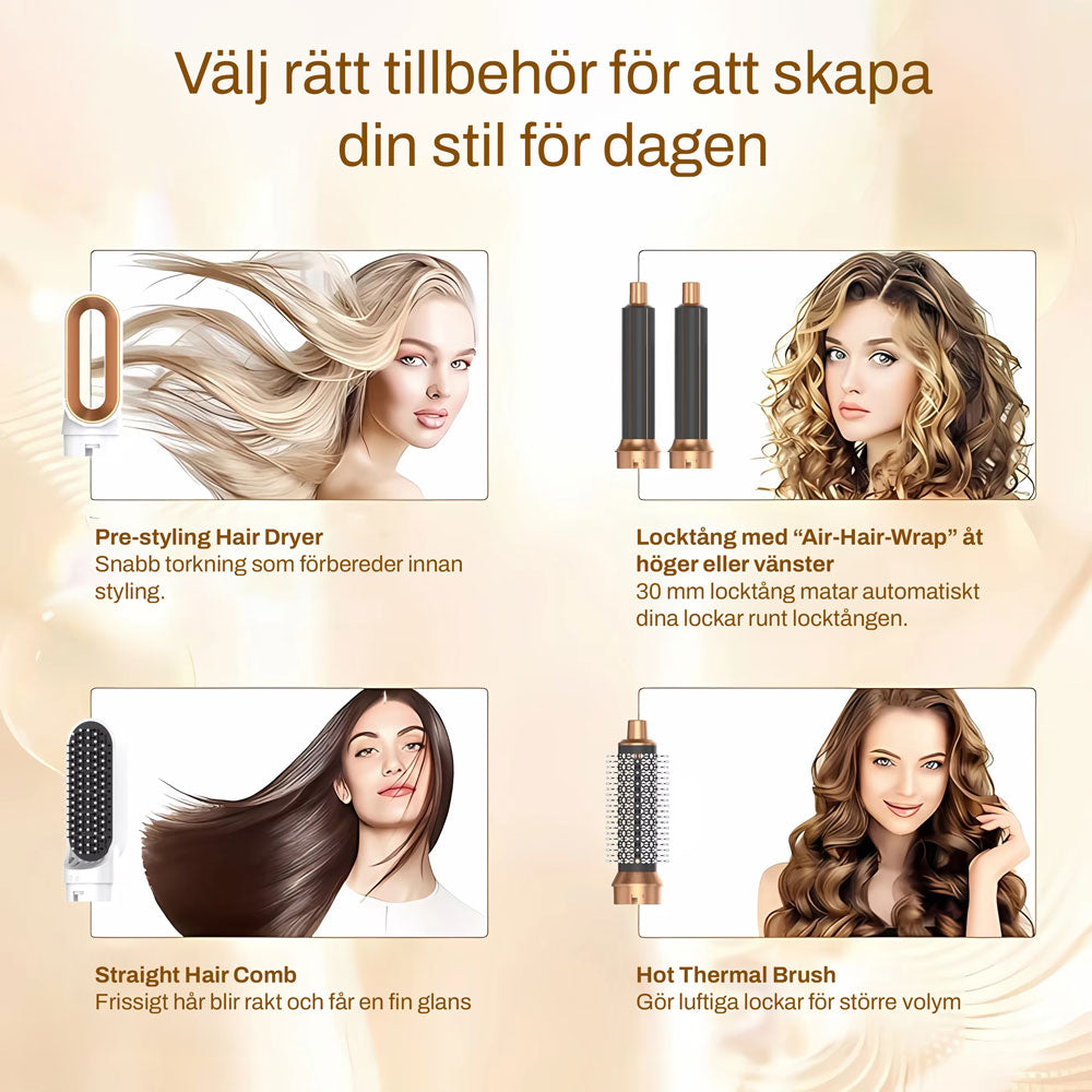 Med vår 5-i-1 Hairstyler fixar du salongskänslan hemma – snabbt, smidigt och skonsamt. Oavsett om du vill ha rakt, glansigt hår till jobbet, naturliga lockar till middagen eller bara en snabb föning efter duschen, så har du allt du behöver i ett enda smart verktyg.